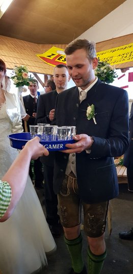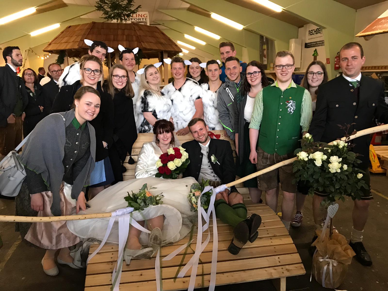 Unser Hans Peter und seine Julia gaben sich das Ja-Wort in Heilbrunn. Nach der kirchlichen Trauung empfangen wir die beiden vor der Kirche und danach stellten wir dem Brautpaar noch einige Aufgaben, die sie hervorragend gemeistert haben.