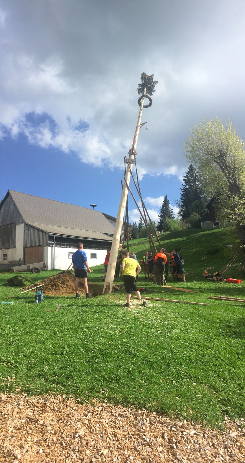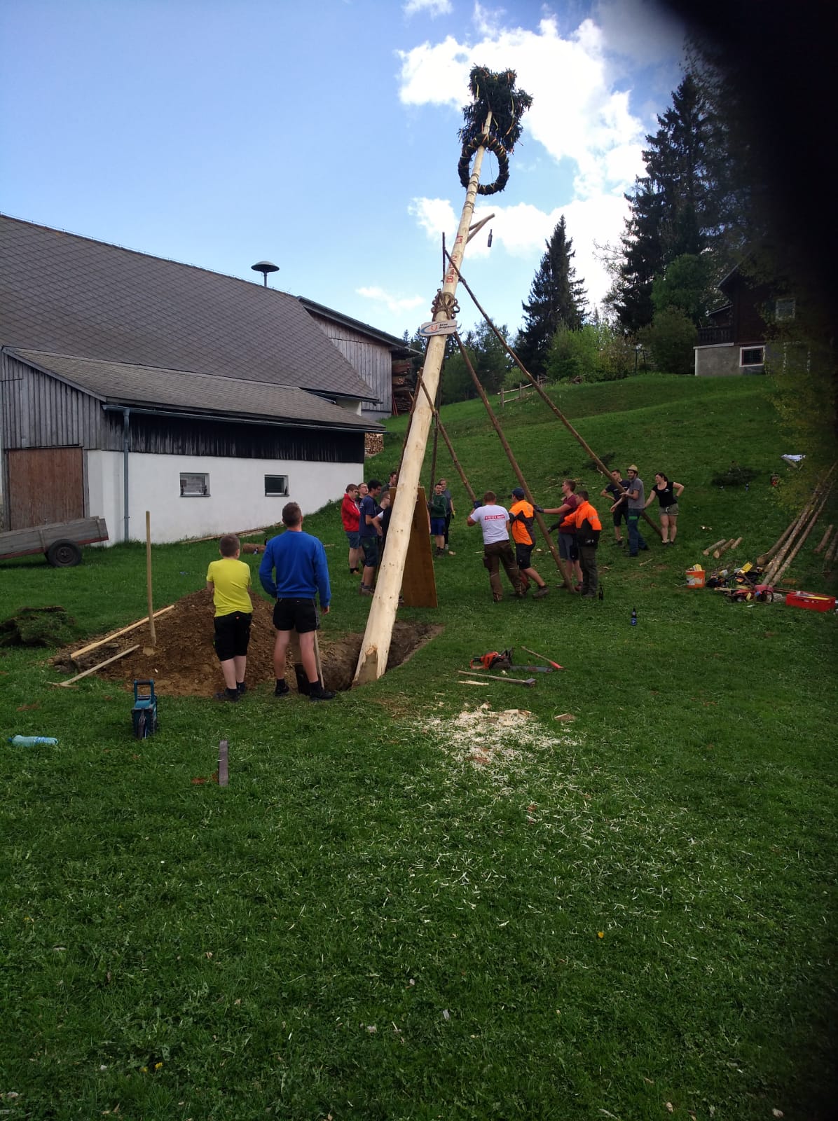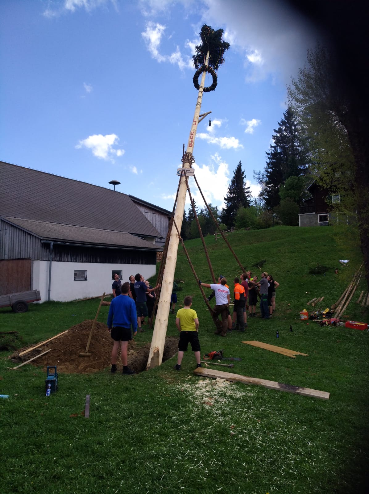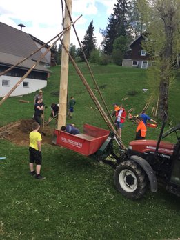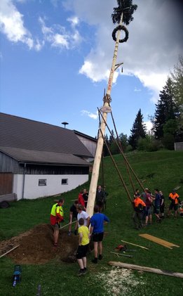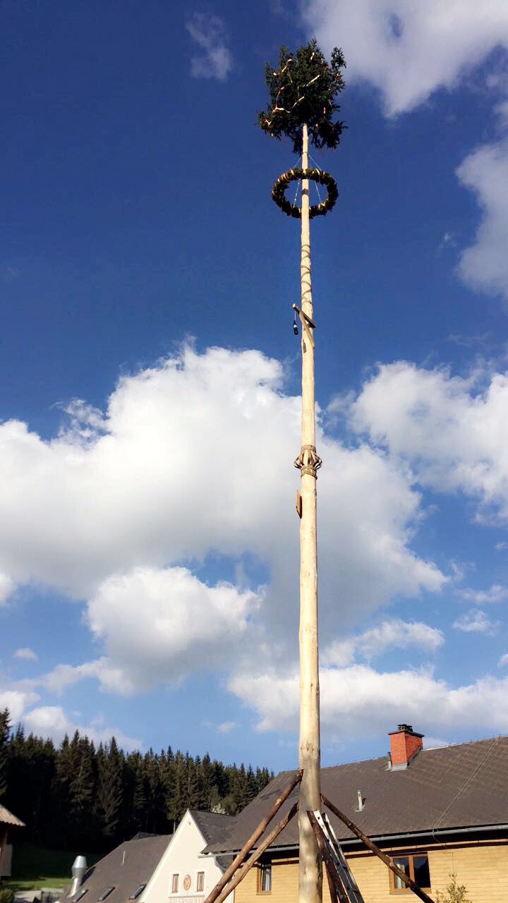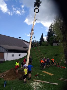 Er steht wieder. Diesmal wurde der Maibaum durch viel Muskelkraft, Schweiß und Fleiß von unseren Burschen und Mädls zum stehen gebracht. Wir fingen bereits am Vormittag zum arbeiten an. Ein Loch musste gegraben werden, der Baum musste noch aus dem Wald geholt werden und zum Schluss wurde der Baum noch geschmückt. Der Maibaumkranz wurde schon vorher bei Fam. Straußberger vlg. Stoana gebunden. Vielen Dank nochmal an die vielen Helfer die so tatkräftig mitgehalten haben.