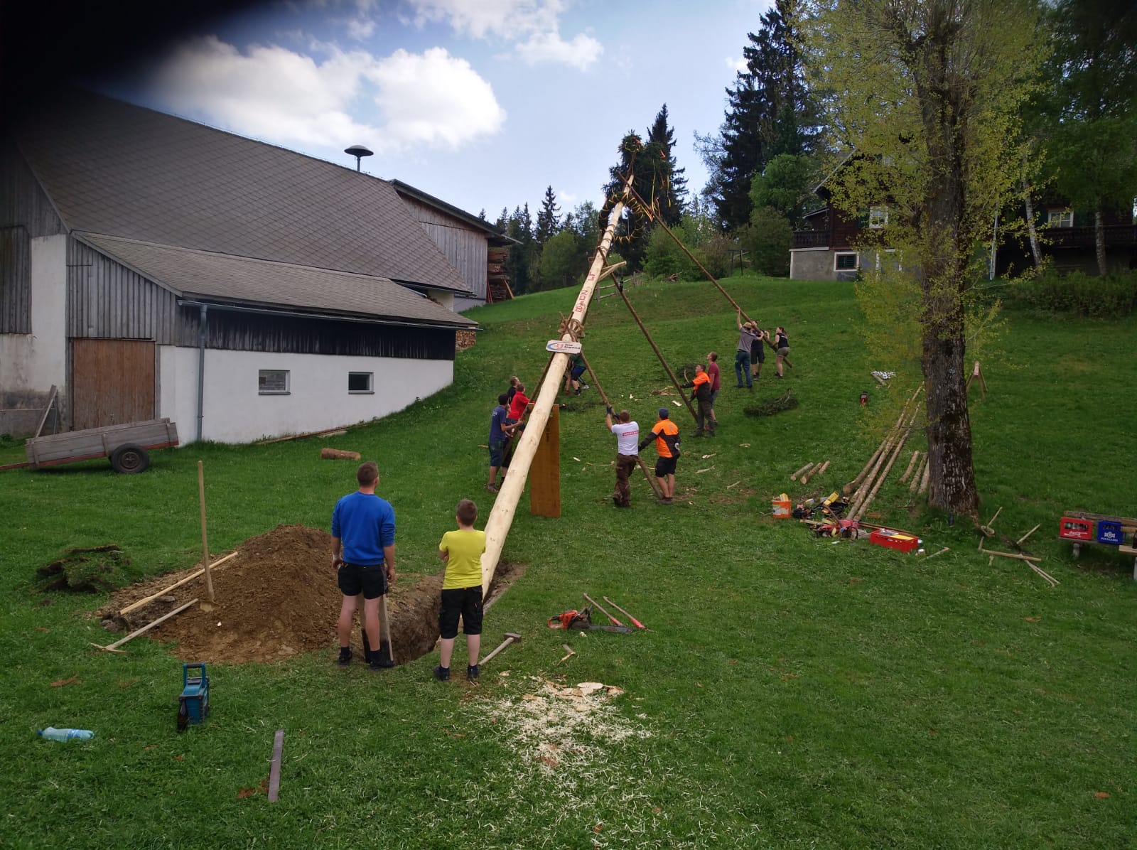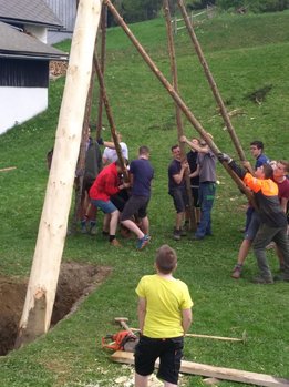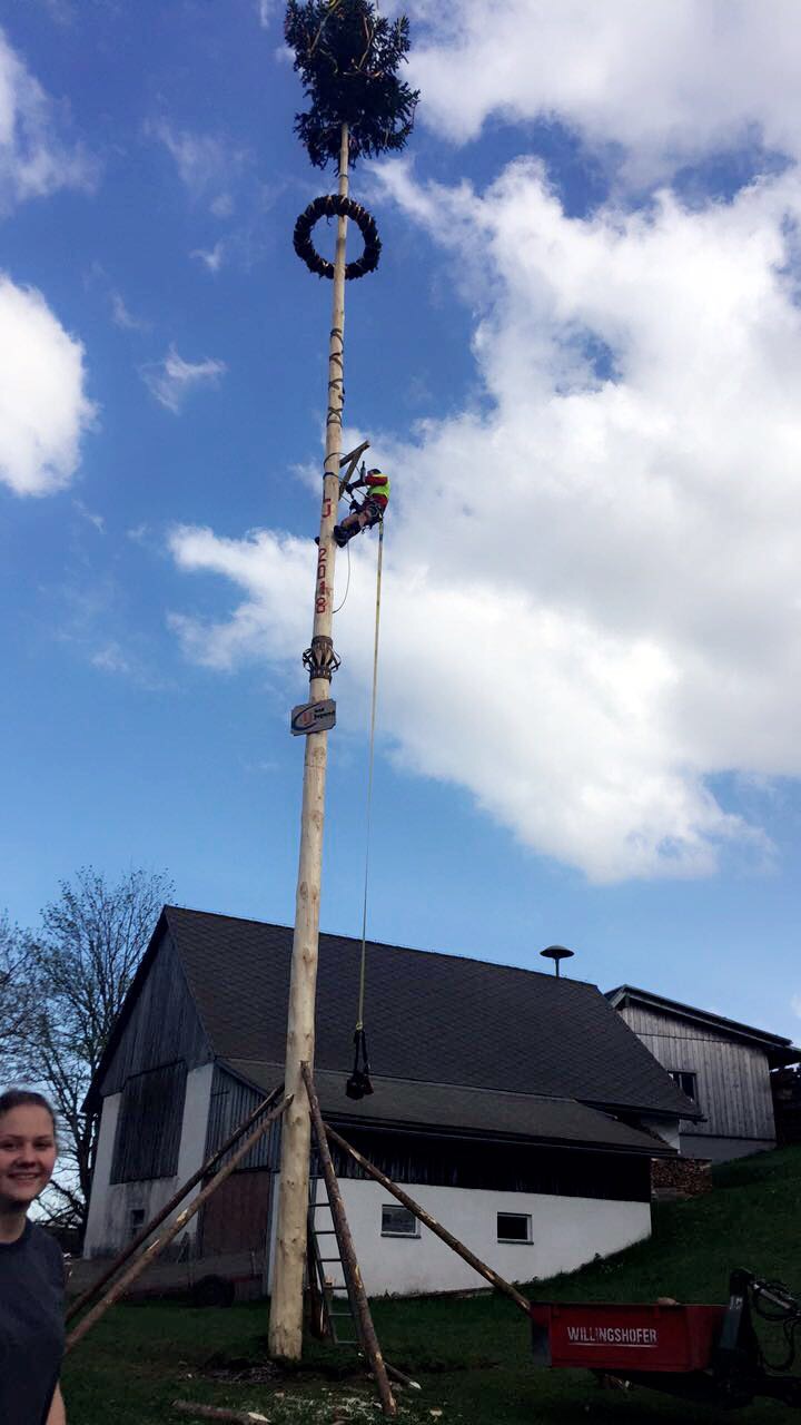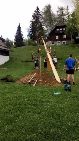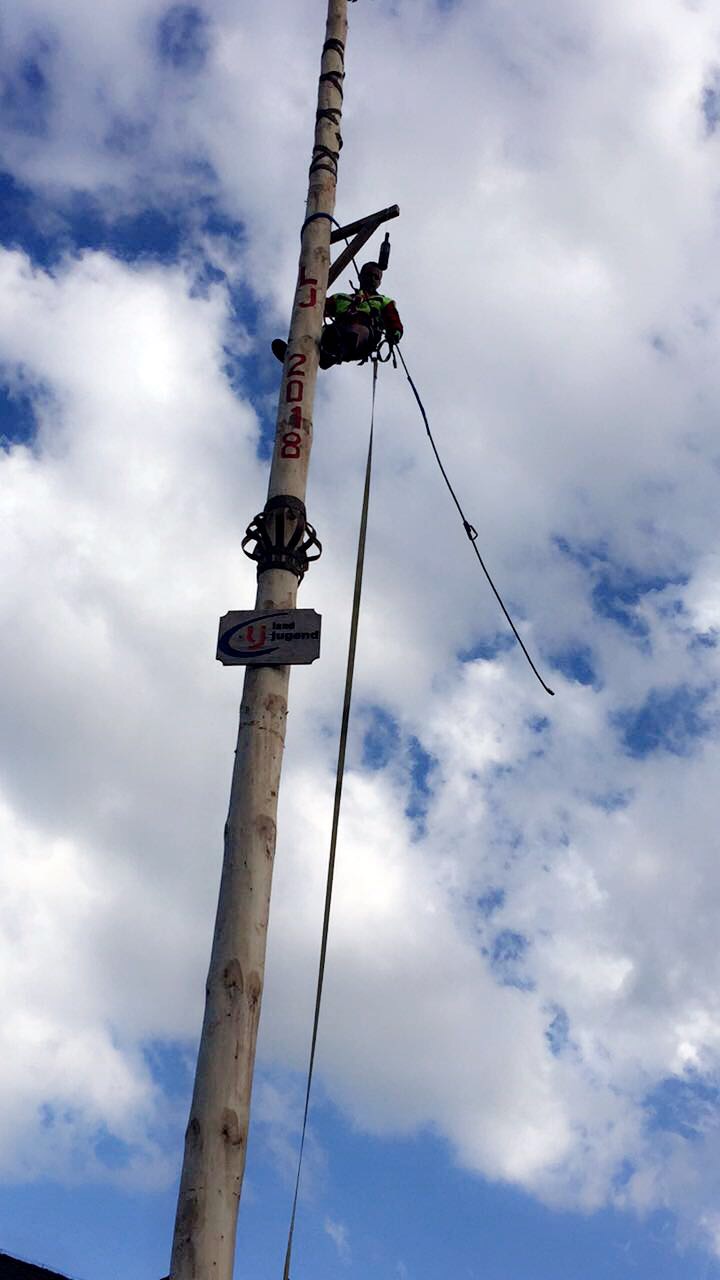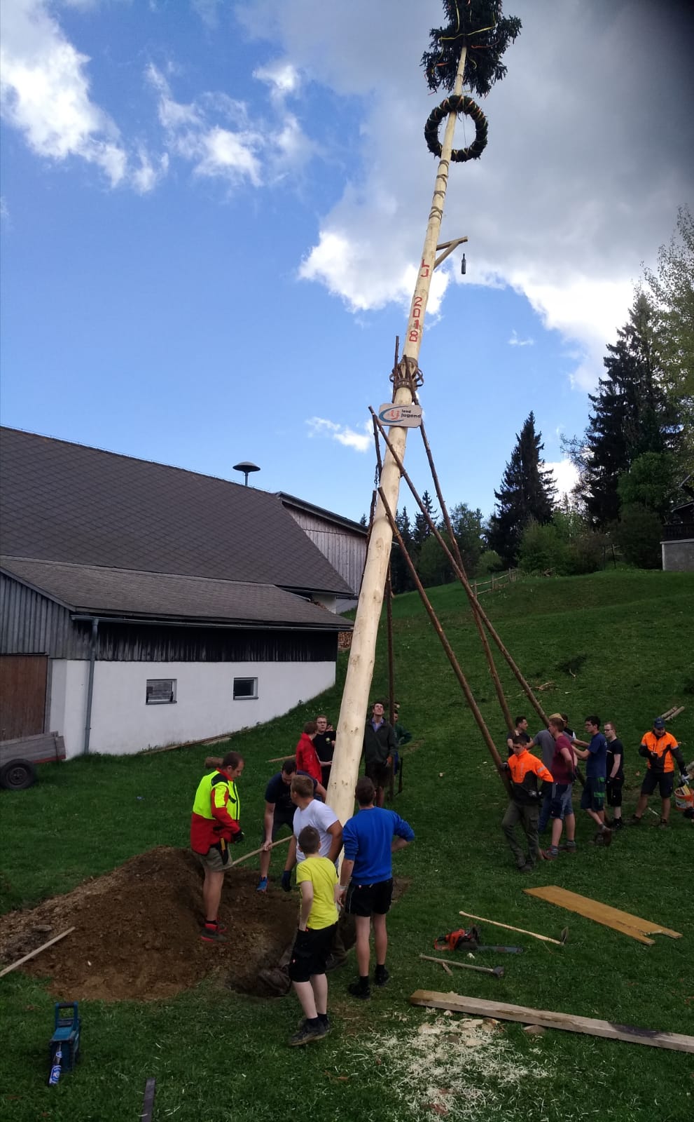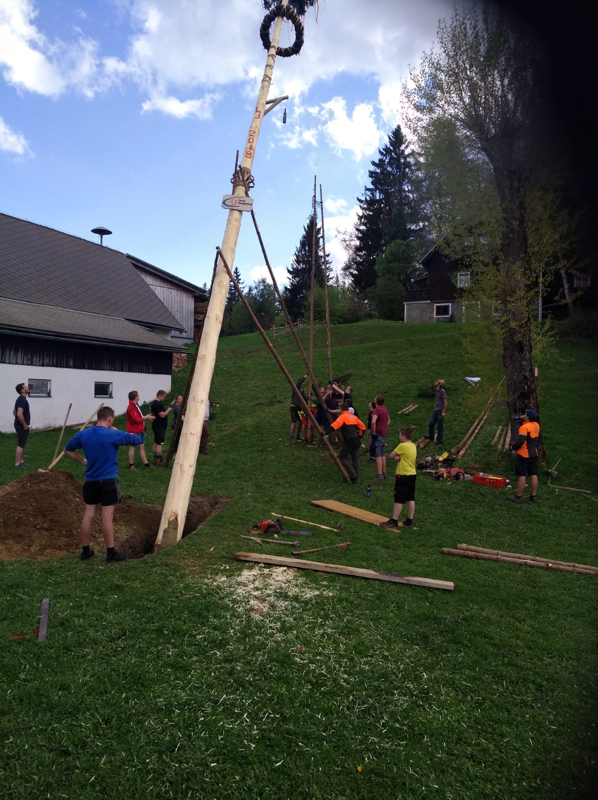 Er steht wieder. Diesmal wurde der Maibaum durch viel Muskelkraft, Schweiß und Fleiß von unseren Burschen und Mädls zum stehen gebracht. Wir fingen bereits am Vormittag zum arbeiten an. Ein Loch musste gegraben werden, der Baum musste noch aus dem Wald geholt werden und zum Schluss wurde der Baum noch geschmückt. Der Maibaumkranz wurde schon vorher bei Fam. Straußberger vlg. Stoana gebunden. Vielen Dank nochmal an die vielen Helfer die so tatkräftig mitgehalten haben.