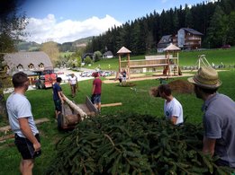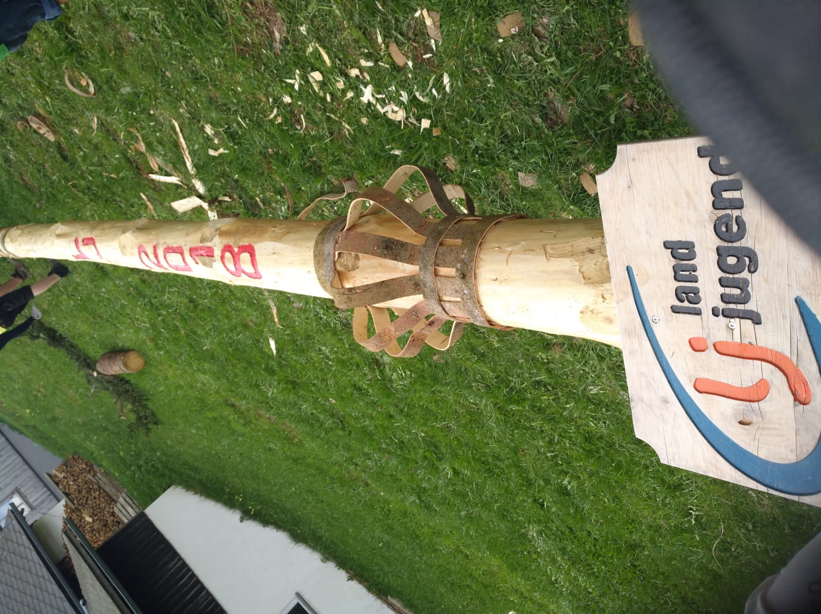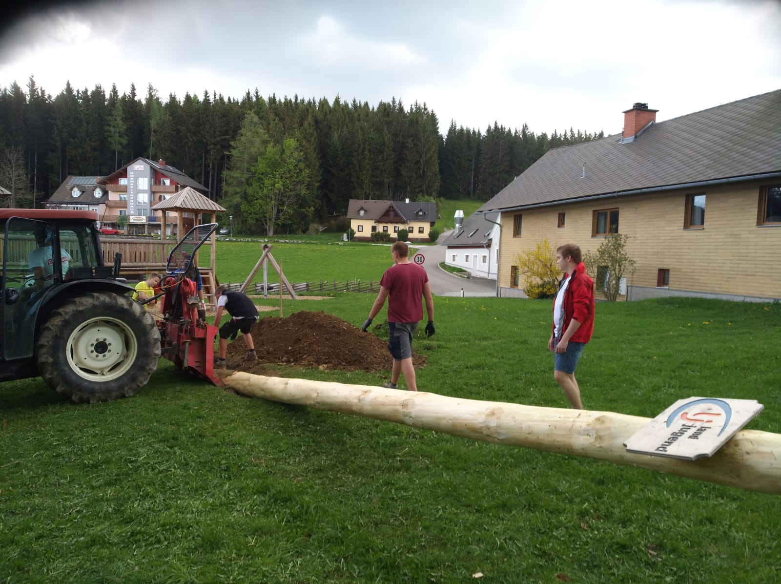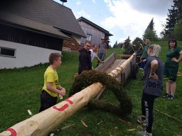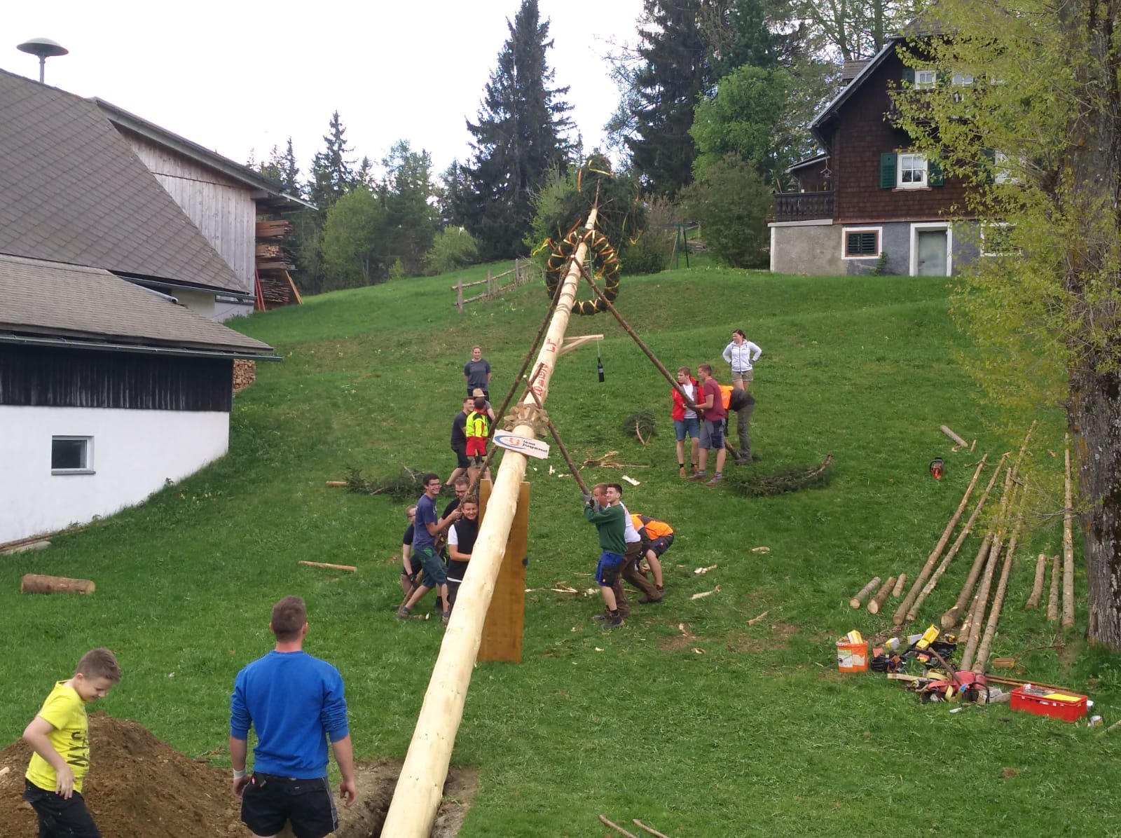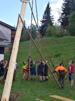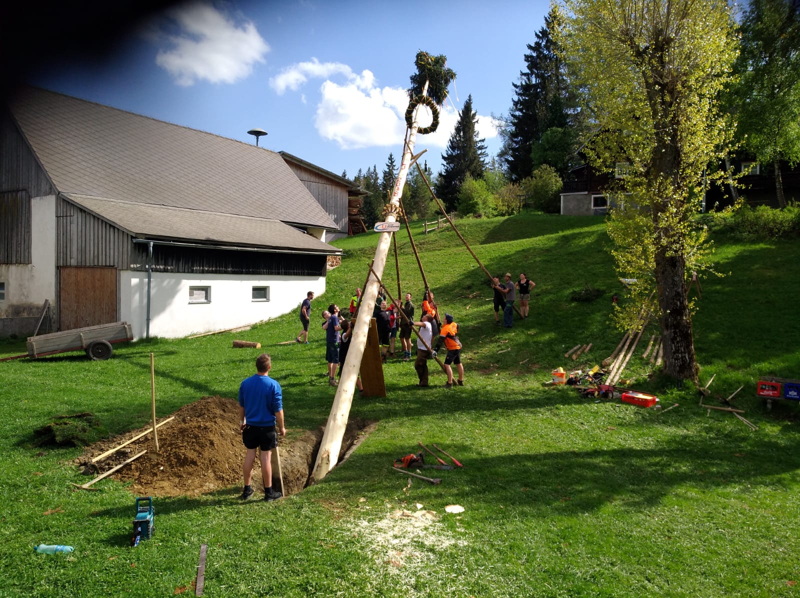Er steht wieder. Diesmal wurde der Maibaum durch viel Muskelkraft, Schweiß und Fleiß von unseren Burschen und Mädls zum stehen gebracht. Wir fingen bereits am Vormittag zum arbeiten an. Ein Loch musste gegraben werden, der Baum musste noch aus dem Wald geholt werden und zum Schluss wurde der Baum noch geschmückt. Der Maibaumkranz wurde schon vorher bei Fam. Straußberger vlg. Stoana gebunden. Vielen Dank nochmal an die vielen Helfer die so tatkräftig mitgehalten haben.