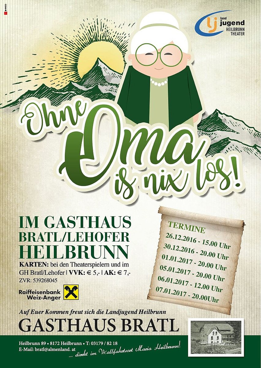 Von 26. Dezember 2016 bis 7. Jänner 2017 spielte die Landjugend Heilbrunn das Theater "Ohne Oma is nix los" im Gasthaus Bratl/Lehofer.